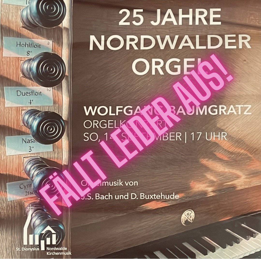 Wir bedauern sehr, mitteilen zu müssen, dass das für den 14.09. angekündigte Orgelkonzert mit Wolfgang Baumgratz aus gesundheitlichen Gründen des Künstlers nicht stattfinden kann. Wir wünschen Prof. Baumgratz gute Besserung und hoffen, ihn später erneut wieder bei uns in Nordwalde begrüßen zu dürfen.