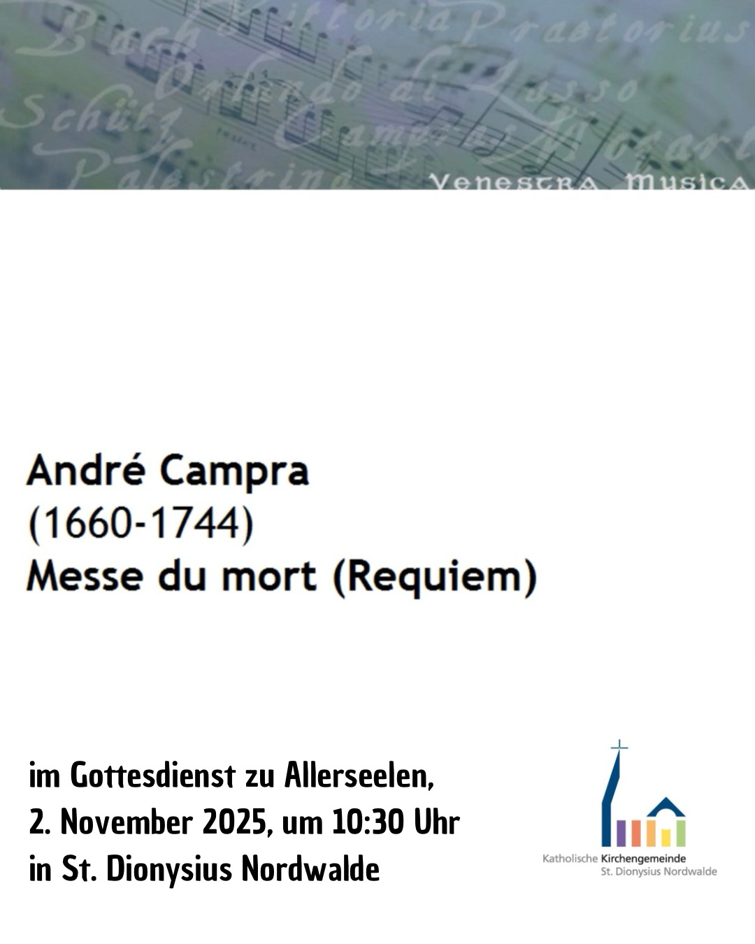 Am Sonntag, 2. November, singt venestra musica um 10:30 Uhr in der Messe Auszüge aus der „Messe du Mort“ (Requiem) des französischen Barockkomponisten André Campra. An einem Tag, der traditionell dem Andenken an unsere Toten gewidmet ist, drückt dieses Werk trauerndes Gedenken, aber auch Trost und Hoffnung auf ein späteres Wiedersehen im Jenseits aus. Wir laden alle Freundinnen und Freunde der Nordwalder Kirchenmusik zur Mitfeier dieses Gottesdienstes in der Pfarrkirche St. Dionysius ein.