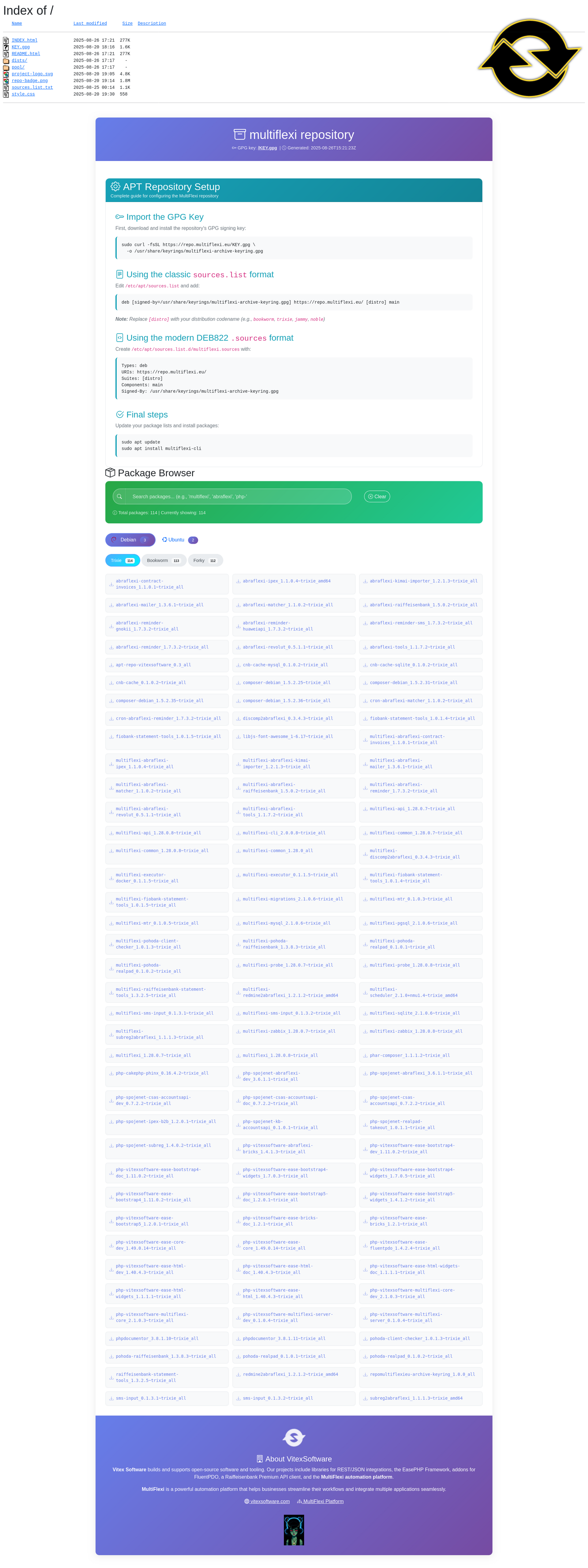 📦 php-vitexsoftware-ease-bricks-doc_1.2.27~bookworm_all.deb\n📦 php-vitexsoftware-ease-bricks_1.2.27~bookworm_all.deb\n📦 php-vitexsoftware-ease-bootstrap5-doc_1.2.0.61~bookworm_all.deb\n📦 php-vitexsoftware-ease-bootstrap5_1.2.0.61~bookworm_all.deb\n📦 certbot-haproxy_0.2.0.40~bookworm_all.deb\n📦 netbeans-php-tools_1.9.20~bookworm_all.deb\n📦 php-vitexsoftware-ease-html-widgets-doc_1.1.1.24~trixie_all.deb\n📦 php-vitexsoftware-ease-html-widgets_1.1.1.24~trixie_all.deb\n📦 multiflexi-redmine2abraflexi_1.2.1.40~bookworm_amd64.deb\n📦 redmine2abraflexi_1.2.1.40~bookworm_amd64.deb\n📦 php-vitexsoftware-ease-bootstrap4-dev_1.11.0.51~trixie_all.deb\n📦 php-vitexsoftware-ease-bootstrap4-doc_1.11.0.51~trixie_all.deb\n📦 php-vitexsoftware-ease-bootstrap4_1.11.0.51~trixie_all.deb\n📦 php-vitexsoftware-ease-bootstrap-widgets-doc_1.1.0.6~bookworm_all.deb\n📦 php-vitexsoftware-ease-bootstrap-widgets_1.1.0.6~bookworm_all.deb\n📦 php-vitexsoftware-abraflexi-bricks_1.4.1.101~bookworm_all.deb\n📦 abraflexi-matcher_1.1.0.93~bookworm_all.deb\n📦 cron-abraflexi-matcher_1.1.0.93~bookworm_all.deb\n📦 multiflexi-abraflexi-matcher_1.1.0.93~bookworm_all.deb\n📦 php-vitexsoftware-ease-core-dev_1.49.0.285~bookworm_all.deb\n📦 php-vitexsoftware-ease-core_1.49.0.285~bookworm_all.deb\n📦 php-vitexsoftware-ease-bootstrap4-widgets_1.7.0.43~bookworm_all.deb\n📦 abraflexi-enhancer_0.2.0.31~bookworm_all.deb\n📦 abraflexi-digest_1.33.1.146~bookworm_all.deb\n📦 multiflexi-abraflexi-digest_1.33.1.146~bookworm_all.deb\n📦 php-vitexsoftware-ease-bootstrap5-widgets-abraflexi_1.4.0.22~bookworm_all.deb\n📦 abraflexi-report-tools_0.5.0.40~bookworm_amd64.deb\n📦 seznamds_2025.5.3.724~bookworm_all.deb\n📦 abraflexi-revolut_0.5.1.39~bookworm_all.deb\n📦 multiflexi-abraflexi-revolut_0.5.1.39~bookworm_all.deb\n📦 php-vitexsoftware-ease-bootstrap4-widgets-abraflexi_1.1.35~bookworm_all.deb\n📦 abraflexi-cashier_0.1.0.20~bookworm_amd64.deb\n📦 multiflexi-abraflexi-cashier_0.1.0.20~bookworm_all.deb