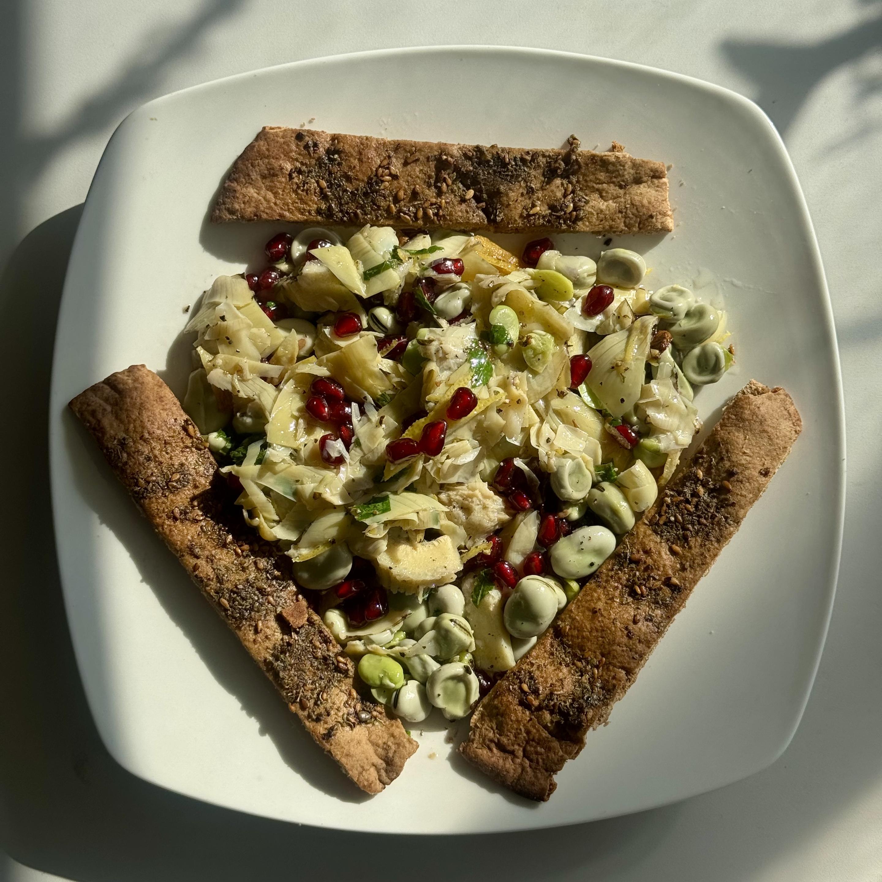 #Vegan lunch: fava beans and grilled artichokes with lemon, pomegranate, crispy garlic and daikon greens, plus pita with za’atar.