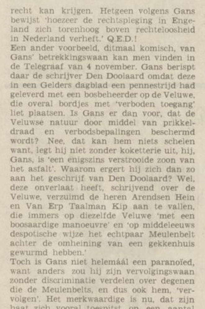 "Een ander voorbeeld, ditmaal komisch, van Gans’ betrekkingswaan kan men vinden in de Telegraaf van 4 november. Gans berispt daar de schrijver Den Doolaard omdat deze in een Gelders dagblad een pennestrijd had geleverd met een bosbeheerder op de Veluwe, die overal bordjes met ‘verboden toegang’ liet plaatsen.’"