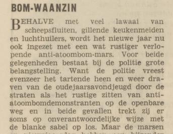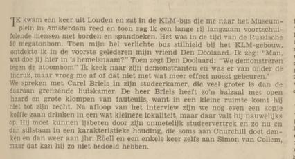 "Dichters en schrijvers hebben hun eigen manier van zeggen. Bij verschillende gelegenheden heeft de wat vaderlijke Den Doolaard al zijn waarschuwend woord laten horen. Maar ook de onbegrijpelijke experimentele vijftigers van toen hebben met ingang van de jaren zestig in rake cynische bewoordingen op de bom-waanzin ingehakt."