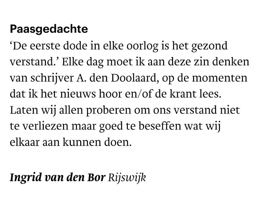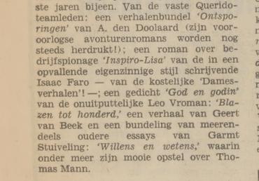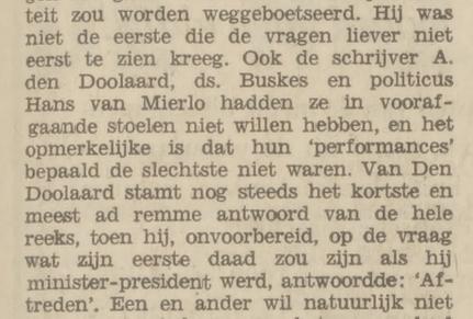 "Van Den Doolaard stamt nog steeds het kortste en meest ad remme antwoord van de hele reeks, toen hij, onvoorbereid, op de vraag wat zijn eerste daad zou zijn als hij minister-president werd, antwoordde: ‘Aftreden’."