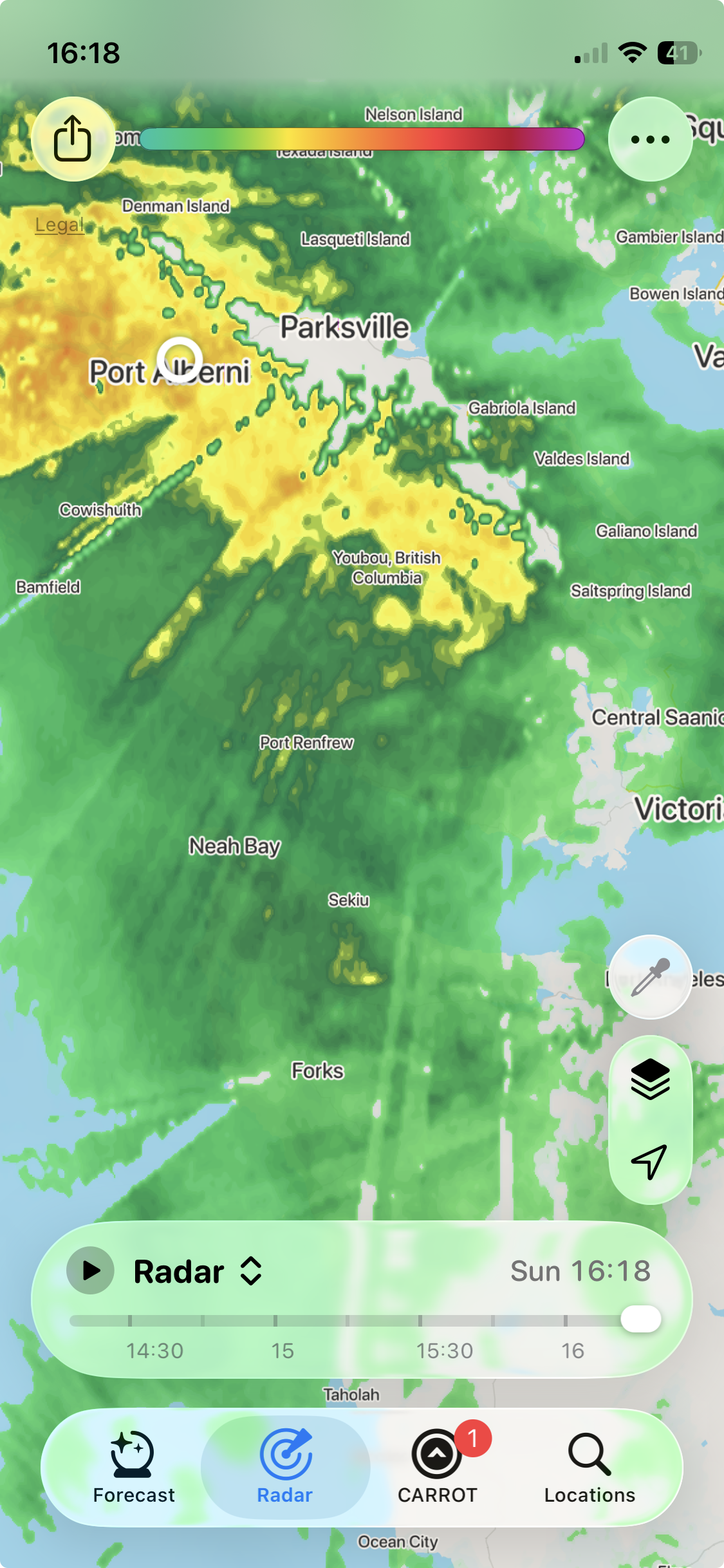 Plenty of rain still to come for the South Island but the back of the frontal system is sliding down the Island. Near Port Alberni now, so that should be the end of this round once it gets to you!