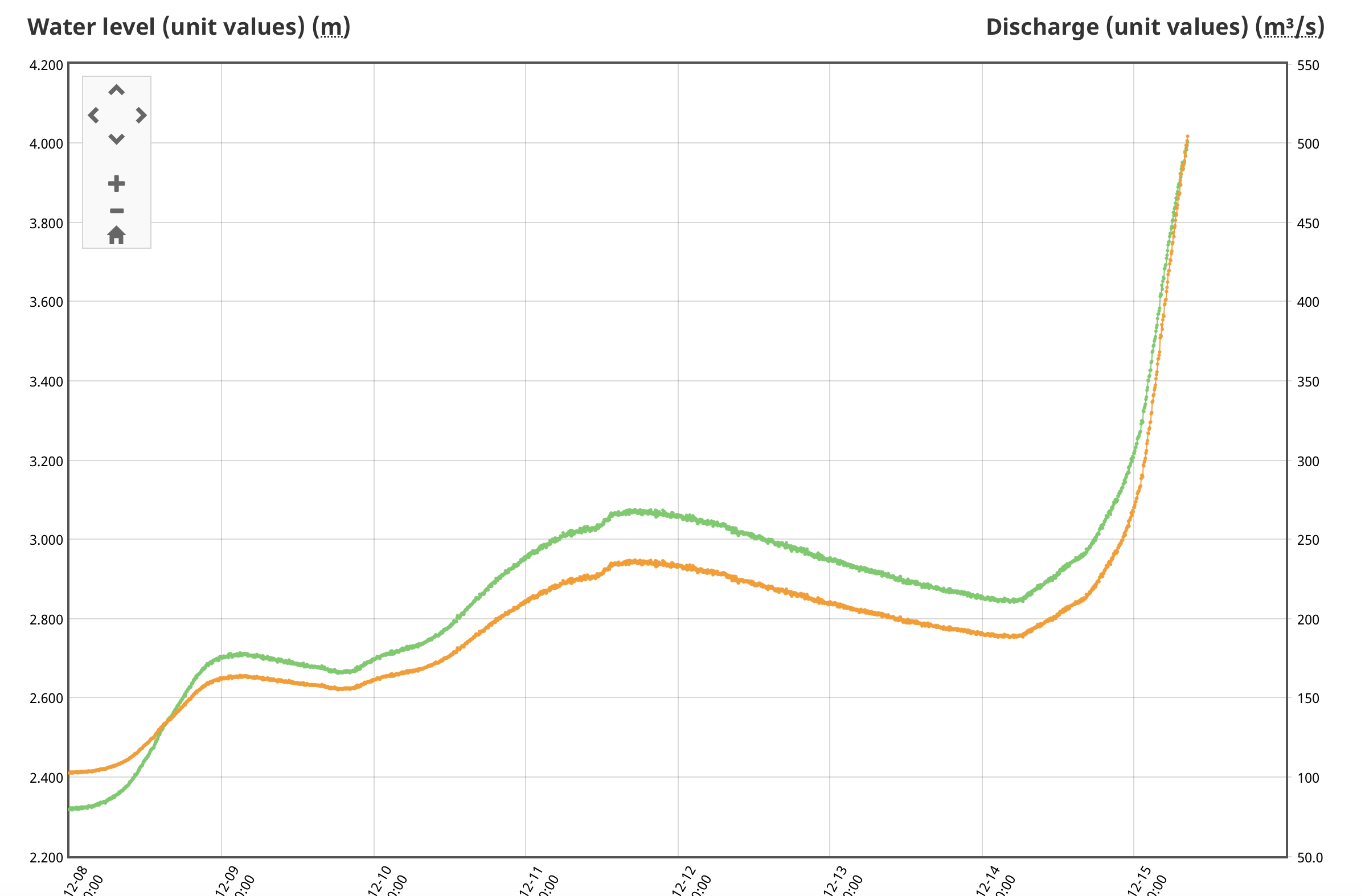 Currently the river (and wind?) is raising the level of the tide in the harbour by 0.4m over the predicted high tide.