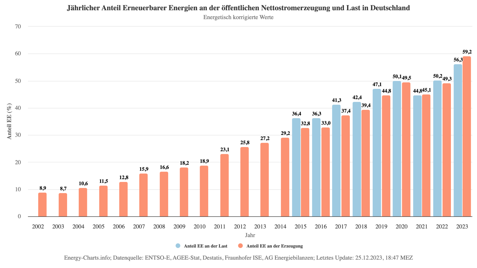 Dort gibt es auch weitere interessante Diagramme zu entdecken, z.B. der prozentuale Anteil in den europäischen Ländern zum Vergleich: https://www.energy-charts.info/charts/renewable_share_map/chart.htm?l=de&c=DE&interval=year&year=2023